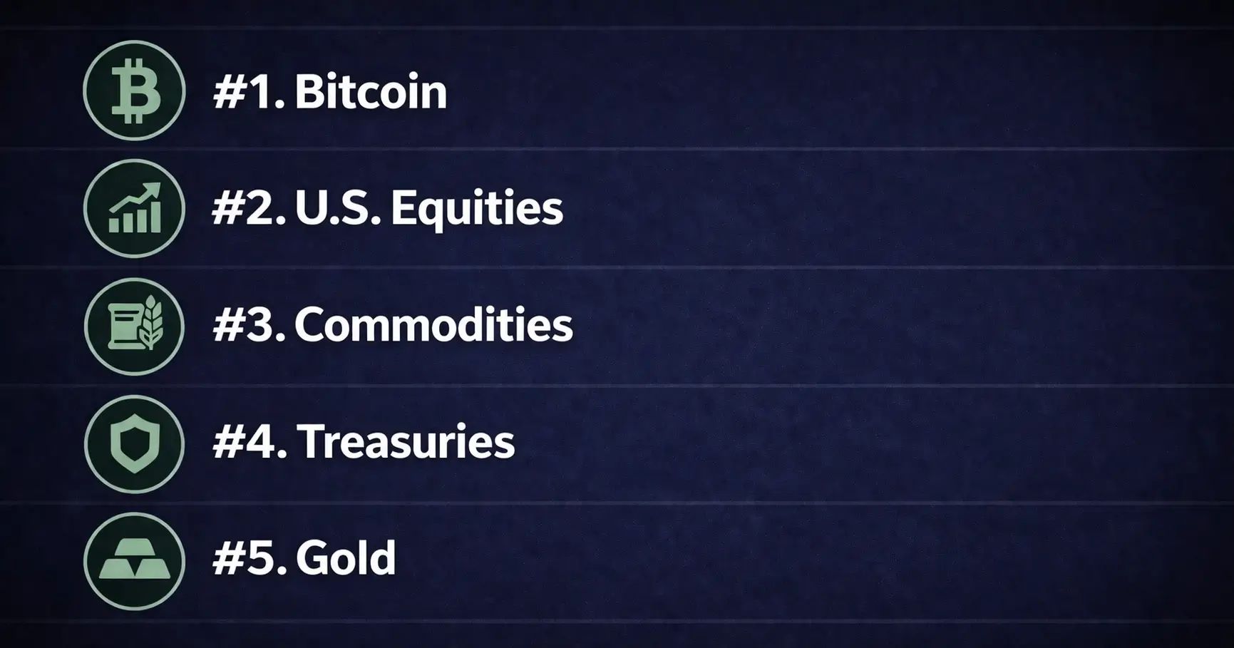 Bitcoin moved up from the lower half of the table into first in this window. U.S. Equities finished second. Commodities held the middle despite only a small gain. Treasuries slipped into the bottom tier. Gold fell to last after materially underperforming the rest of the group. The order changed at the top and weakened in the defensive layer.